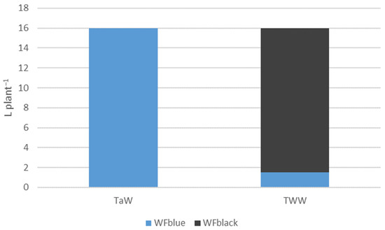 The WF was estimated for the young olive trees of the experiment irrigated with TWW and TaW (Figure 1). Since rain was prevented from reaching the plants as they were kept in the greenhouse and irrigation volume was based on the actual water needs, no N leaching took place and only the WFblue was computed. The blue WF was distinguished in two components based on the water source, thus WFblue and WFblack were computed for the TaW and TWW treatments, respectively. Fridman et al. [24] proposed the extension of WFblue to include alternative water sources. If we consider the fact that treated wastewater is discarded in the receiving water bodies, hence being wasted, then its reuse in agriculture appears as a great opportunity for the reduction in fresh water resource abstraction for irrigation.