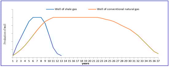 Economists believe that natural gas production marginal cost could certainly reach $4 to $5 per Mbtu []. The actual price was approximately $3 per Mbtu in 2012 but was over $4 per Mbtu in 2013 and 2014. This price could be less than the marginal cost of production in the long term with shale gas. In addition, the life of the operation of well shale gas is shorter than that of the production well for conventional gas. Moreover, the life cycle of well shale gas is shorter than the well conventional natural gas, and the production of shale gas declines rapidly after the peak of production (Figure 1). As such, it is necessary to continue the supply of investment capital. At present, some gas producers in the United States are going to reduce their production and their investments in shale gas development activities.