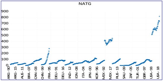We used the gross fixed capital formation (GFCF) as capita consumption, like several other researchers [,,,,,]. We used 14 of the G20 countries from 1994 to 2018. The European Union (EU), China, Mexico, Russia, Saudi Arabia, and the USA were removed from the sample. The reasons for removing the countries are because the EU consists of 28 countries, including some G20 countries, and the natural gas consumption of China, Mexico and USA have outlier values among other countries (Figure 2). For Saudi Arabia, we have a lack of data on the gross fixed capital formation variable. Figure 2 shows that China, Mexico, Russia, the USA, and Saudi Arabia are the outliers and very different structures for natural gas consumption. These countries have different economic, industrial and population levels. When we are selecting variables, we try to absorb these big differences, such as using population density instead of population, using CO2 per capita instead of total CO2 emissions, which are affected by the size of the economy.