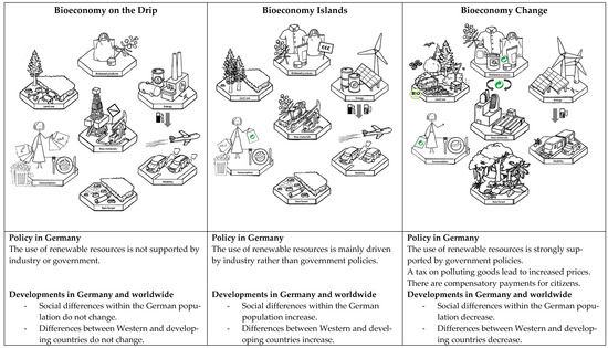 Three very different scenarios for Germany in the year 2050 were developed in this way, varying according to the extent of transition each scenario envisaged and the consequences of the respective degrees of integration of bio-based economic activities. Thus: the first scenario, “Bioeconomy on the Drip”, depicts the lowest level of transition towards a bioeconomy and the least changes to people’s current lives; the second scenario, “Bioeconomy Islands”, represents a resource-intense bioeconomy with intensified socio-economic polarization; and the third scenario, “Bioeconomy Change”, shows the highest degree of transition with major short-term adaptations but greater socio-economic unity in the long term (see also [37]).