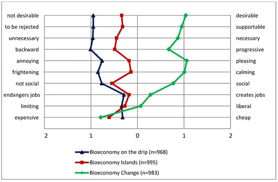 The “Bioeconomy Islands” scenario was also rated very low in all evaluation dimensions of the semantic differential. Likewise, this scenario was also perceived as being “antisocial” and rather “annoying” for the study participants. In the case of the “Bioeconomy Change” scenario, the respondents show positive attitudes reflected in almost all the evaluation dimensions, with the mean values all to the right of the central line with the exception of the “expensive—cheap” attribute pair (Figure 2). The perceived positive characteristics of this scenario seem to outweigh, for the participants, the negative effects of products being more “expensive”.