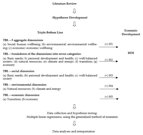 At the country level, the need for the existence of a concordance between the administration of social, environmental, and economic resources can be identified [13,14]. Thus, it may be asked whether the different dimensions of TBL influence the countries’ ED in a positive way; the following hypotheses were formulated: