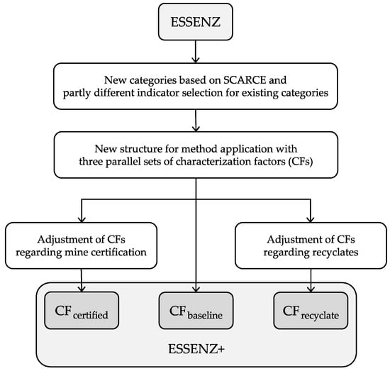 The objective of this paper is the methodological enhancement of ESSENZ. To achieve this goal, the individual shortcomings are identified, and on condition of feasibility, considered in the method adjustment (Section 2) leading to the so-called ESSENZ+ method (Section 3). The results are demonstrated with the help of a case study on batteries (Section 4). For the raw materials examined in the case study, the characterization factors (CFs) of ESSENZ+ are provided. Finally, the approaches of the methodological enhancement and of the case study are critically discussed (Section 5) and conclusions are drawn (Section 6).