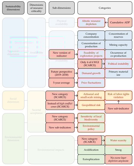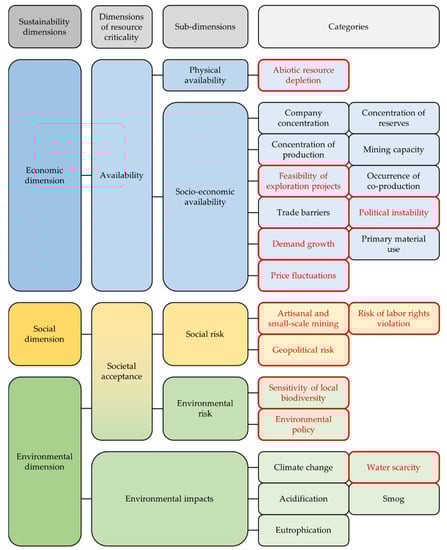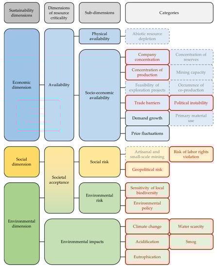 Resources are crucial for a stable economy and society. Due to fast-growing industries and technological development, the demand for resources, especially for abiotic resources such as metals and fossil fuels, has increased considerably over recent decades []. The resulting exploitation of resources leads to adverse effects on all three dimensions of sustainability: the environment becomes polluted and climate change is amplified [,]; socio-economic problems such as supply risks occur, which are provoked, for instance, by high concentrations of reserves and production [,,,]; and furthermore, social issues such as child labor and violations of human rights arise, especially in connection with artisanal and small-scale mining [,,]. To ensure access to, and use of, resources in the future in a justifiable manner, these issues have to be addressed. This can be done using criticality assessments that aim at hotspot analysis and risk mitigation []. In recent years, several assessment methods regarding resource efficiency and criticality have been developed [,].