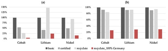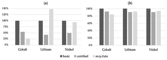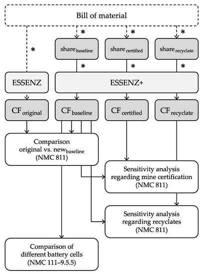 ESSENZ+ introduces a new structure of three different sets of CFs to be used in parallel. This approach allows the recognition of mine site certifications and the incorporation of product-specific recyclate rates in ESSENZ+. The application of the parallel CF sets begins in the inventory phase; after the bill of material (BoM) of the analyzed product is related to the functional unit of the study, the mass of each considered raw material is multiplied with the respective shares, i.e., the percentage of material that is sourced from certified mine sites (), and the percentage of secondary material, i.e., recyclate, used in the product (). The remaining mass share is obtained with the multiplication of the BoM with ( obtained with Equation (3)).