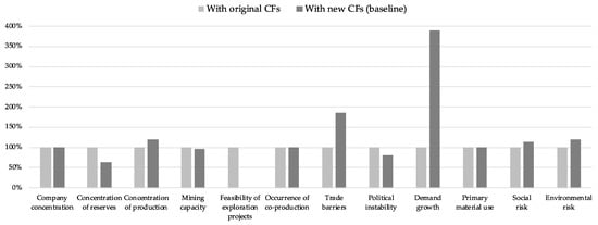 Price fluctuations are quantified with the volatility indicator provided by the Federal Institute for Geosciences and Natural Resources (BGR) []. However, whereas ESSENZ uses the one-year value, ESSENZ+ applies the five-year value. This long-term indicator is more robust. The one-year value already fluctuates within half a year, as the example of aluminum illustrates, indicating a price volatility of 7.7% for the period from June 2020 to May 2021 [], and 16.5% from December 2020 to November 2021 []. The five-year value from January 2016 to December 2020, however, is 12.5% [,].