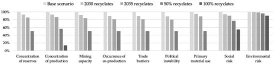 The ESSENZ method (hereinafter referred to as ESSENZ) assesses resource use on a product level including all three dimensions of sustainability [,,]. It allows for a comprehensive assessment of resource use by addressing environmental impacts, criticality, as well as societal aspects. Environmental impacts are determined for the categories of acidification, eutrophication, climate change, ozone layer depletion, and photochemical ozone creation. For criticality, overall, 11 aspects are taken into account, which reflect medium-term factors that potentially decrease the availability of resources, and therefore, lead to a higher supply risk. The categories are: concentration of production and reserves, company concentration, feasibility of exploration projects, political stability, occurrence as co-product, mining capacity, primary material use, demand growth, price fluctuations, and trade barriers. Societal aspects address compliance with social standards (here: child labor, forced labor, and high conflict zones) as well as environmental standards (here: environmental performance of country’s policies).