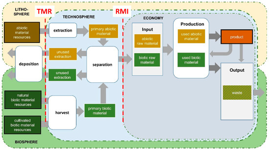 Based on the definition of TMR, the total extraction of primary materials is accounted for. While the system boundary for the TMR is based on the demarcation of the natural environment (bio-geo-sphere) and the technosphere (also called the anthroposphere), the system boundary for the RMI is delineated by the distinction between the economy and the non-economic world.