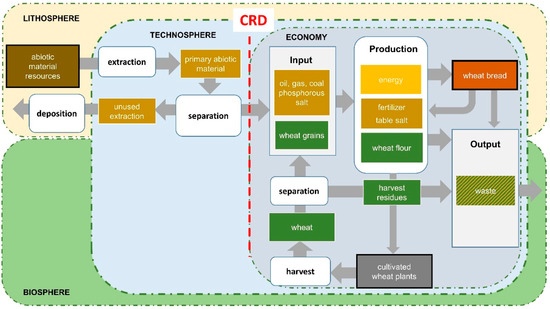 According to this understanding, all agricultural processes are economically driven, and the open fields of wheat production are considered to be within the economy. Consequently, only abiotic raw materials enter the economy and are accounted for by the CRD, i.e., the inputs of abiotic raw materials, such as crude oil for the diesel of tractors, phosphorus for fertilizer, and salt as bread ingredients. Although wheat bread production requires the inputs of biotic raw materials such as wheat grains for flour production, neither the harvested wheat nor the wheat grains are counted because the cultivation of wheat plants is considered part of the economy.