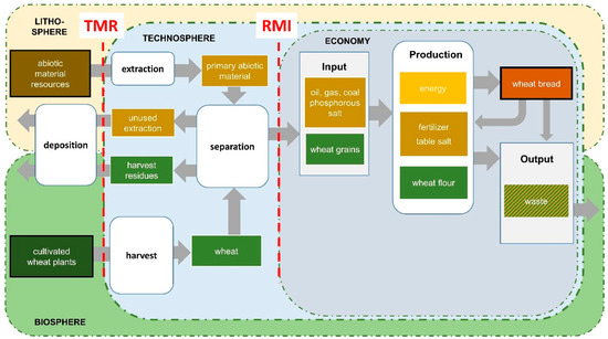 In contrast, the concept of RMI and TMR considers the agricultural production, in this case the cultivated wheat plants, as part of the biosphere (Figure 4). The rationale is that without natural processes in the soil and the atmosphere, determining rainfall, soil moisture, and nutrient availability, and natural side vegetation, mitigating soil erosion and hosting pollinators, etc., agriculture in the open field would hardly be possible.