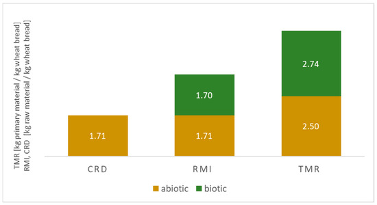 The calculation results of the abiotic and biotic parts of the compared indicators CRD, RMI, and TMR for the production of 1 kg of wheat bread are shown in Figure 5.