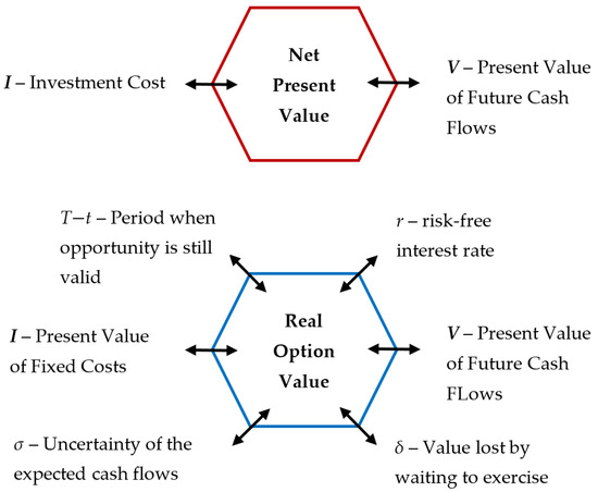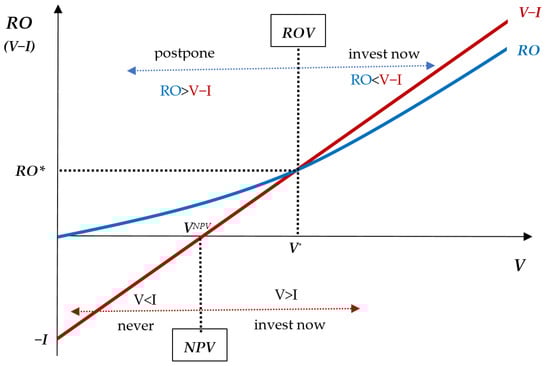 Comparison of Investment Decisions between Real Options Value and Net Present Value. (Note: RO—real option, V—present value of cash flows, I—present value of fixed costs, NPV—net present value, ROV—real options value).