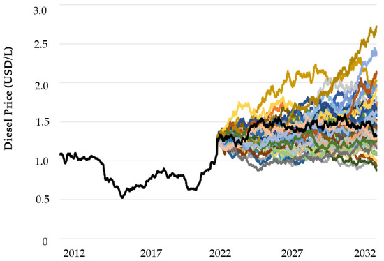 For the calculation of the stochastic prices of fuel, this research uses a 10-year historical weekly time series data to estimate the future prices of diesel as shown in Figure 3. Using the Augmented Dickey-Fuller unit root test, this study confirms that diesel prices follow GBM with annualized average return μ = 1.33% and annualized volatility σ = 0.94%. These parameters are substituted in Equation (10). The impact of the Russia-Ukraine conflict on future oil prices is estimated using the Poisson Jump Process with the jump size k = 1.7%, and jump frequency λ = 1.37.