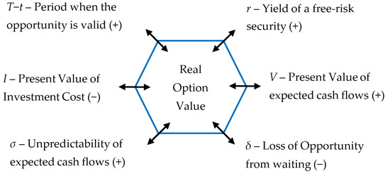 Applying the real options approach, this study finds higher real option values than NPV which imply a better decision to postpone the energy transition to more favorable investment conditions. This result supports previous findings [62,64,65], which found values in delaying investments in utility-scale and residential solar PV. Investment in the energy transition is largely impacted by the uncertainties in costs and revenues, hence, the timing is relevant to consider when making investment decisions in huge projects, which require high initial capital [64]. To maximize this flexibility value, an investor or project planner must respond to the six levers influencing the value of real options as shown in Figure 4.
