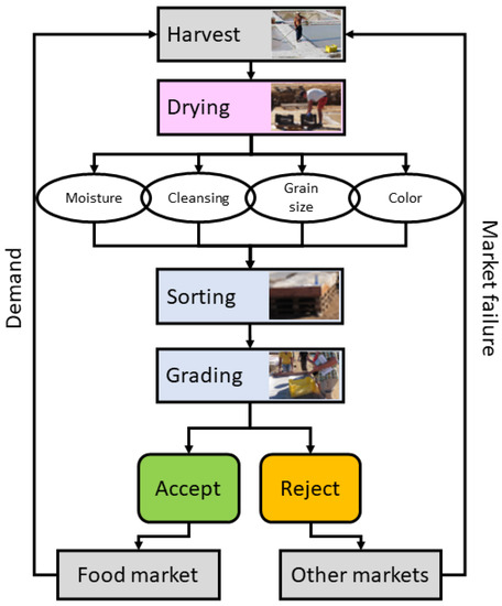 Conceptual model used for flower of salt selection and grading to address market demand. The entire process is shown, from the initial stage of ‘Harvest’ to the ‘Grading’. In ‘Harvest’ salt-workers or marnotos collect the floating flower of salt with a special rake called ‘the sieve’. In ‘Drying’, the flower of salt collected is left to dry in open air during the day and covered by late evening. In the final step of the evaluation process the stages include ‘Sorting’ (acceptable or not) and ‘Grading’ (from least acceptable to best and usually according to grain size)—where there is included the 4-step set of visual characteristics choices—before the decision of acceptance or rejection. Source: Author’s own elaboration.