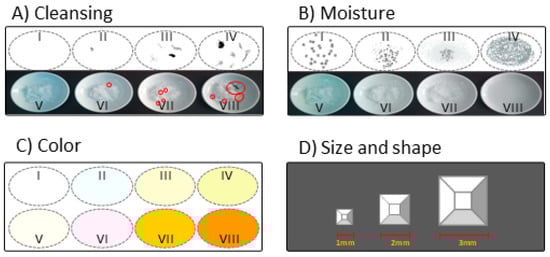 Set of characteristics used for grading flower of salt. (A) Cleansing—fleur de sel samples: (I) immaculate (when no fouling of dirt is detected), (II) acceptable (with an insect that is easily removable in order to be clean), (III) with some different sources of dirt (insects, crustaceans, small twigs or leaves of plants), (IV) very dirty [with a wide variety of sources of dirt (insects, crustaceans, small twigs or leaves of plants, bird feathers, stains)]; (V–VIII) are the real image equivalents of I–IV (red circles highlight some dirt spots). (B) Moisture—fleur de sel samples: (I) loose (practically dry or with minimal humidity levels), (II) low humidity (if it does not exceed about 7% humidity, it is still acceptable for commercialization), (III) wet (requires more drying time), (IV) wet (in this state the crystals re-dissolve in water); (V–VIII) are the real image equivalents of (I–IV). (C) Color—fleur de sel samples: (I) opaque white (rich in minerals), (II) transparent (at the end of the season, when the waters already have few minerals), (III) light pink hue (generally derived from the halophytic bacteria present in the brine), (IV) light orange hue (generally derived from the microalgae Dunaliella salina that can grow in brine water), (V) eggshell hue, (VI) slight grayish or brownish hue, (VII) deep yellow, (VIII) orange incorporated into the crystals (derived from the microalgae D. salina). (D) Size and Shape—fleur de sel samples acceptable for culinary consumption (from the smallest crystal (1 mm) to the largest (3 mm). Source: Author’s own elaboration.