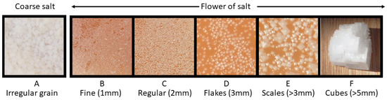 Results showing the typology according to the grain size: Common coarse salt (A) and flower of salt (B–F). Source: Author’s own elaboration.