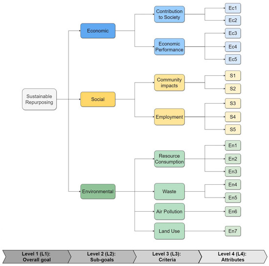- Level 2 includes the economic, social, and environmental sub-goals that form the overall goal;