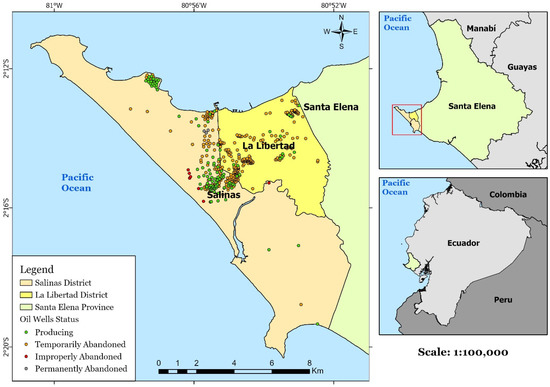 The study area is located at the centre of the coast of Ecuador (Figure 1). The Ancon oilfield comprises a large part of the territory of Santa Elena Province (SEP). The territorial extension of the province is 3665 km2 [67], of which 1200 km2 correspond to the oilfield [68]. The cities of Santa Elena, La Libertad, and Salinas have a combined population of 401,178 inhabitants [69]. The main economic activities in the SEP are tourism, mining, oil production and refining, and fishing [70]. The parish of Ancon is a sector that belongs to the Decentralised Autonomous Government of Santa Elena. The cultural heritage Santa Elena in Ecuador is tied to its English architecture and the site of the country’s first oil well [71].