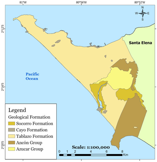 The geological framework of SEP consists of soils and sedimentary rocks [72]. SEP is a coastal region of Ecuador with significant geological complexity [73,74,75], with stratigraphic successions and sequences ranging from the Upper Palaeocene to the subsidence of the Progreso Basin [76]. Figure 2 shows the formations present in this area, listed according to the following stratigraphic deposition: Ancon, Socorro, Passage Beds, Azúcar, Santa Elena, Cayo, Calentura and Piñón. The Calentura Formation has potential as a hydrocarbon-bearing rock, and the Socorro and Passage Bed formations are reservoir rocks [77]. The Cayo Formation outcrops on the offshore front present clayey and calcareous shales with secondary silicification. The Azúcar Formation has rocks of moderate tenacity, containing alternating thin sandstone layers and black siliceous shales. The Ancon Group has clay Passage Bed, Socorro, and Seca formations. They have a sequence of greyish green clays, thin sandstone layers with greenish-grey shales, and sandstones with shales in thick layers, respectively [78]. The Tablazo Formation is the most outstanding in Santa Elena, and it presents fine agglomerates, sandstones, and fossiliferous sands [74] used for construction and handicraft materials. Finally, there are indications that the Ancon oilfield and the Peru-Bank block belong to the same petroleum system, the Progreso Basin, which is part of the Cretaceous–Paleogene [79]. Furthermore, the oil from the Ancon field has an API gravity of 33.4° [80], so it is the highest quality oil in Ecuador.