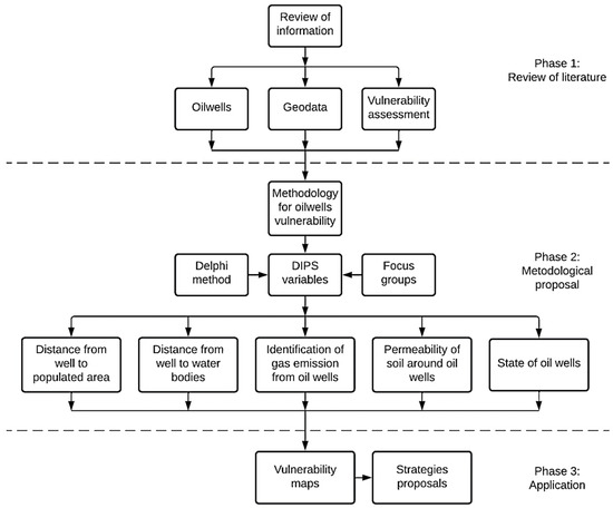 The methodology of this study consisted of three phases (Figure 3): Phase 1 focused on reviewing scientific literature, determining vulnerability types, analysing the territory’s current situation, and collecting available data (mainly regarding their geographical location) from oil wells [81,82].