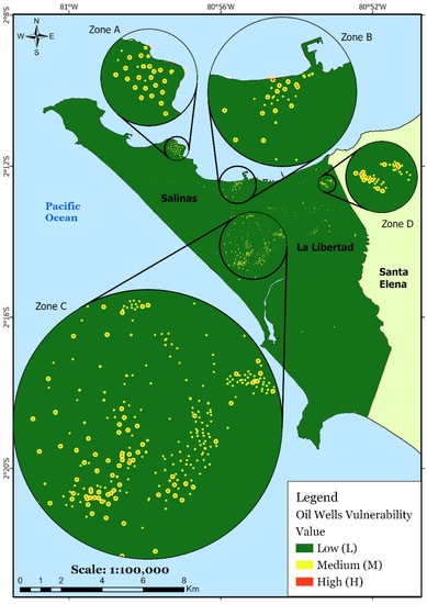 In Santa Elena Province, Ecuador, the oil search and exploitation era began in 1911 with the drilling of the Ancon 1 well [66]. The population grew near the oil infrastructure during the time of peak hydrocarbon exploitation activities. In this context, our research question was: how should one develop a methodology to help measure a territory’s vulnerability due to oil wells in populated areas? This work was aimed to propose a methodology based on the variables of distance (to populated areas and water bodies), identification of gas emission from oil wells, permeability of soil around oil wells, and state of oil wells (DIPS) to assess a territory’s vulnerability to oil wells using technical and environmental analysis for area management. The proposed methodology was applied to a coastal area with oil activity that coexists with urban areas.