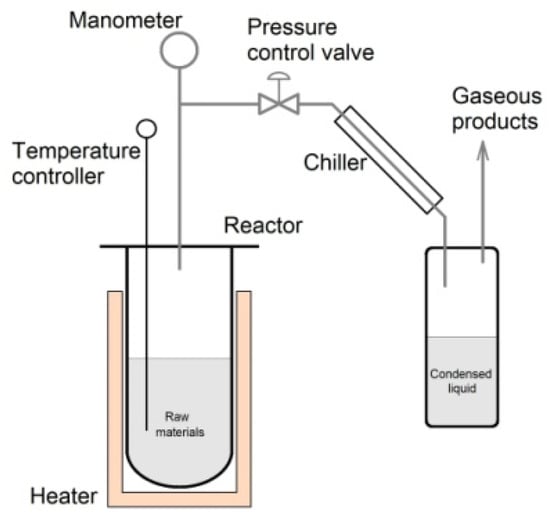 The reactor is a steel retort designated to operate at temperatures up to 700 °C and pressures up to 12 MPa. The temperature regime of the reactor is set by an external heater. A required amount of raw material is placed in the reactor before starting its operation. 100.0 g of raw material was used in each experiment. The experiment with each sample was repeated three times. The temperature of the reaction mixture is controlled by a temperature controller, and the pressure in the reactor is controlled by a manometer.