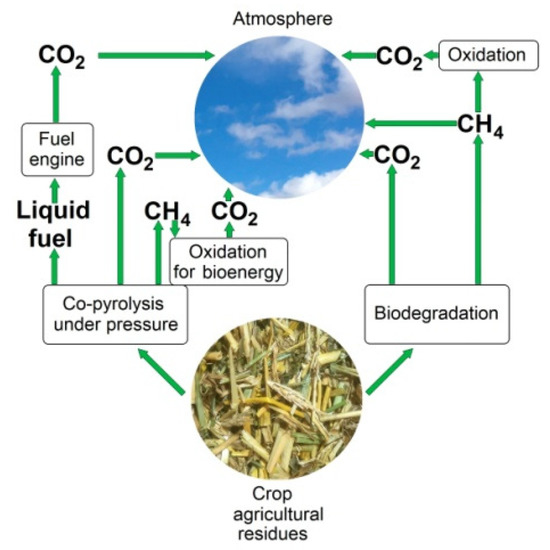 In the case described in this article—co-pyrolysis under pressure—there are three ways of generating carbon dioxide, and only one of them is the result of a direct co-pyrolysis process. The other two ways involve the formation of carbon-storage intermediates in the form of hydrocarbons, but in these cases, the hydrocarbons are designated for the controlled oxidation to produce bioenergy. Thus, the methane generated directly in the co-pyrolysis process is used directly in a plant for energy consumption within the process. Biofuels (the most left way on the figure) are intended to be used in engines as a replacement for fossil fuels, so this carbon enters the atmosphere only in the form of carbon dioxide.