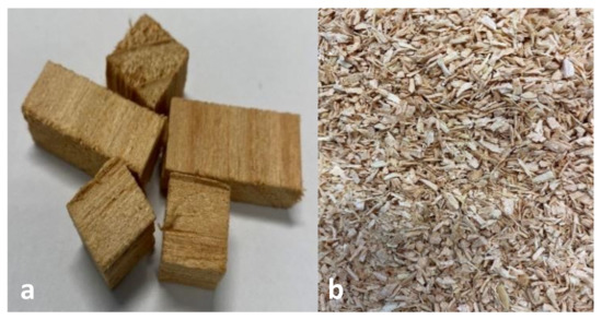 (a) Burnt pinewood sample cut into cubes; (b) shredded burnt pinewood sample.