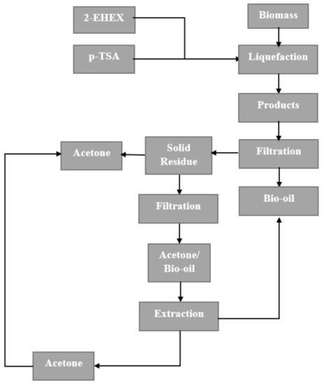 After the liquefaction reaction, the glass reactor was cooled down until it reached 40 °C to apply vacuum filtration by using the BUCHI (Flawil, Switzerland) vacuum pump V-700. After obtaining the bio-oil, the solid residue was washed with acetone to remove the bio-oil residue and obtain acetone/bio-oil.