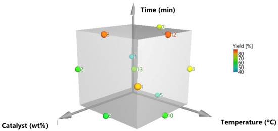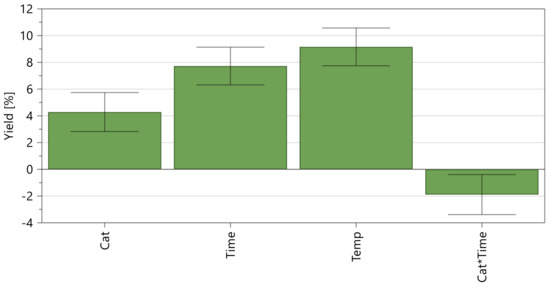 First, the effects of three variables (T, cat, time), the second-order effects, the interactions between the two variables (T*cat), temperature and catalyst concentration were evaluated. Figure 4 shows the coefficient plot of the model, as well as the correlation coefficient. The influence of each variable is a measure of the effect of its variation on the response. It can also be observed that the factor with the most significant influence on the conversion is temperature, while the catalyst concentration has a lower influence on the yield.
