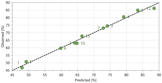 The obtained model offers a good correlation with the experimental data as R2 = 0.988. This R2 value indicates that 98.8% of the observations can be explained by the independent variables in the factor range, while the other 1.2% cannot be explained. The model shows a remarkable ability to predict new correct responses with a probability of 98.8%. The Q2 value of 0.765, ideally >0.5, showed a high predictive power, allowing a confident estimation of the effect of changing process parameters and process optimisation. The model also showed a strong validity score, far exceeding the required value of 0.25. Similarly, the obtained value of 0.988 for reproducibility, which significantly exceeded the required value of 0.5, indicating good experimental control and low pure error [41].