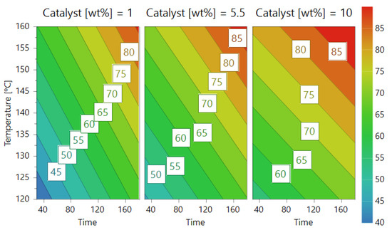 The contour plot of the model is presented in Figure 6, showing that temperature is the most important factor. However, the reaction time also acts in parallel with the conversion. In fact, conversions above 80% can be achieved using a low catalyst concentration (1%) as long as the temperature is applied at the highest level (160 °C) and the longest reaction time (180 min). In addition, when using a reaction time of 180 min and temperatures below 160 °C, the liquefaction conversion is always less than 85%, even when using the highest amount of catalyst (10%).