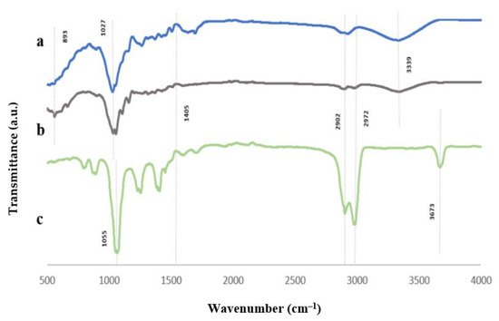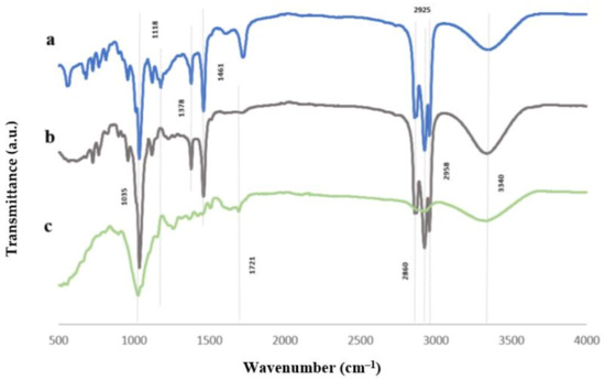 FTIR-ATR spectra of (a) fresh biomass, (b) solid residue from the sample with the worst conversion and (c) solid residue from the sample with the best conversion.