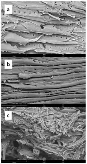 A Scanning Electron Microscopy (SEM) analysis was performed to observe morphological changes in pine wood before and after the liquefaction reaction. The microscope used was a Phenom ProX G6 from ThermoFisher Scientific (Waltham, MA, USA) under a low vacuum detector and at around 60 Pa as the pressure level.
