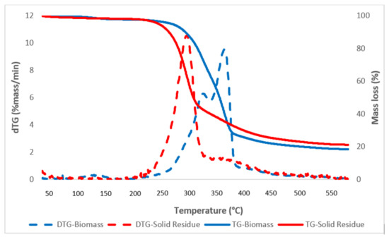 TGA (solid lines) and DTG (dashed lines) curves for biomass and solid residue sample with the best conversion.