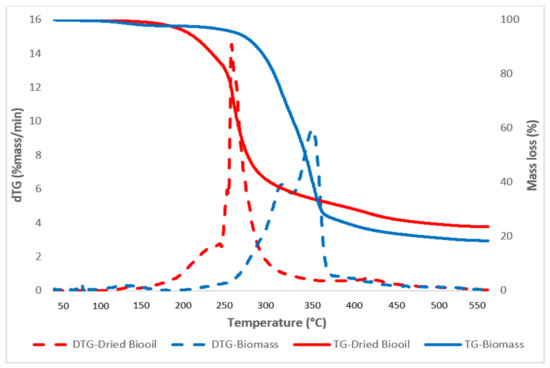 The third step, between 360 and 590 °C, is attributed to the formation of non-degradable ash and carbon from the slow degradation of the sample. The DTG curves show that the bio-oil reduces its weight at an early stage and confirms the presence of lighter products such as aldehydes, alcohols, and carboxylic acids than its biomass counterparts [50]. The volatile and small organic molecules can degrade in this stage; however, non-volatile macromolecular substances decompose between 375 and 550 °C due to thermal degradation of the bio-oil as a result of the pyrolysis phenomena [51].