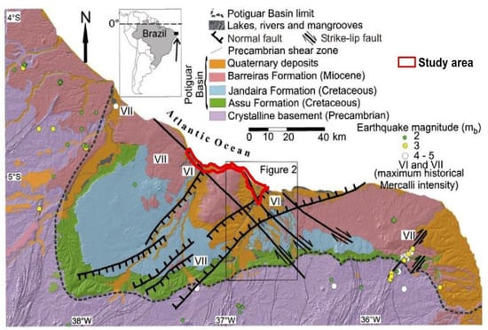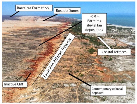 The Atlantic margin of the South American Continent is considered passive, with an extension of more than 11,000 km from Guyana to Argentina. Most of this stretch belongs to Brazil, which has around 7,500 km of coastline in the passive margin. However, a punctual stretch of this margin hosted Quaternary tectonic activity which generated cliff uplift in rocks dating from the Neogene in the Ponta do Mel region. Neotectonics have been recorded in other stretches of the Brazilian coast [15], but these were unable to generate “tectonic reliefs” on the coast.
