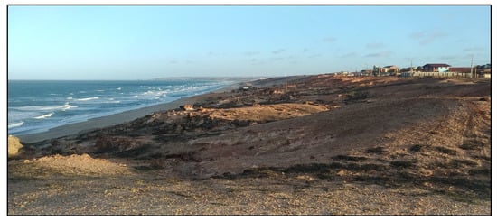The Gado Bravo Beach (Figure 3B) corresponds to a beach geoform characterized by intense anthropisation, with the densification of the coastal strip interfering with the beach morphology. Here, the local population is confronted with the consequences of the wind transport of sediments that reach the houses.