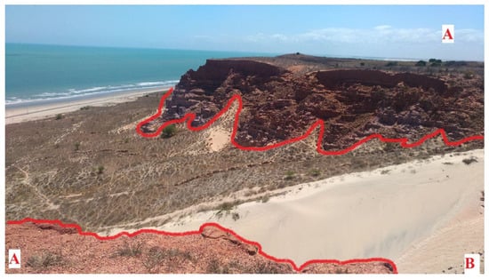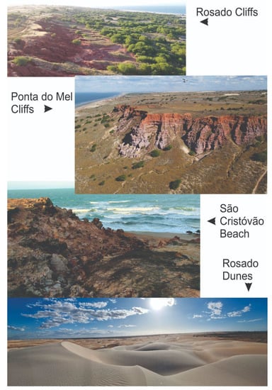 The São Cristóvão Beach comprises cliffs and semi-fixed dunes occupying a canyon area with inactive erosive activity. It has good conditions of access and visualisation of features. The beach runs along a stretch characterised by minor tectonic activity that has uplifted the sandstones of the Barreiras Formation up to about 10 m height into active cliffs (Figure 4). The entire stretch of the Costa Branca consists of a low-lying coast with Quaternary sedimentation of marine terraces, beaches, and estuaries; the cliffs at the edge of the basin in Icapuí, state of Ceará, and the cliffs of São Cristóvão and Rosado are an exception because these localities have hosted enough tectonic activity to expose the Barreiras Formation, dating back to the Miocene [20] (Figure 4, Figure 5 and Figure 6).