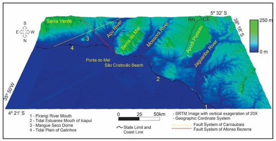 Digital figure elevation model of the Açu, Mossoró, and Jaguaribe estuaries. Source: Reprinted/adapted with permission from Ref. [24]. Copyright 2017, Diniz and Vasconcelos.