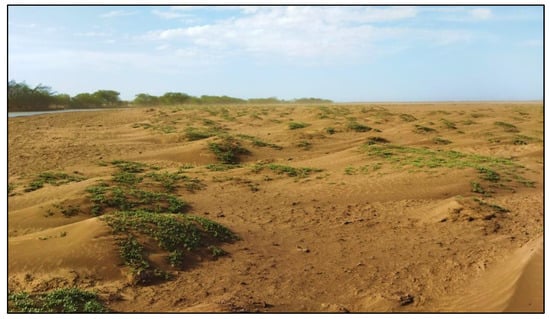 The particularities and geomorphological features of the hypersaline desert are further influenced by the large extent of the fluviomarine plains, combined with strong winds and considerable sedimentary input. These in turn are responsible for the emergence of an embryonic dune field, formed by fine sandy sediments and fluvial muddy clays (Figure 7).