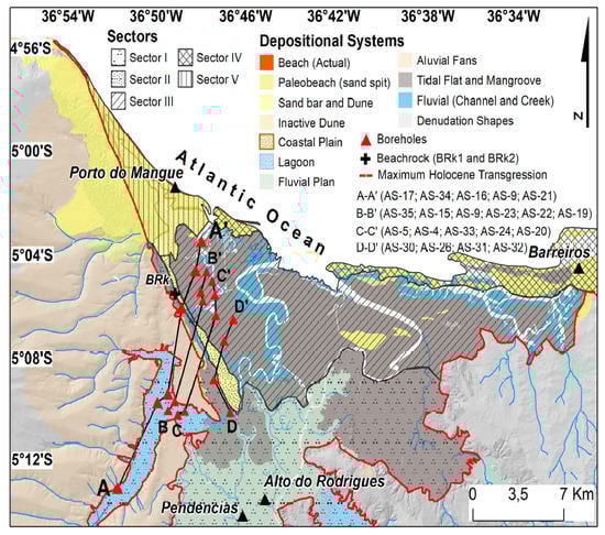 - Barbosa, M.E.F.; Boski, T.; Bezerra, F.H.; Lima-Filho, F.P.; Gomes, M.P.; Pereira, L.C.; Maia, R.P. Late Quaternary infilling of the Assu River embayment and related sea level changes in NE Brazil. Mar. Geol. 2018, 405, 23–37. [Google Scholar] [CrossRef]