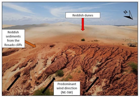 The site of the Rosado Dunes is located between the municipalities of Porto do Mangue and Areia Branca and hosts the largest mobile dune field in the state of Rio Grande do Norte. The dunes are positioned on the leeward side of the Rosado Cliffs (Figure 10) and are characterised by a typical reddish colouration directly related to the Rosado Cliffs. The white sediments coming from the strand are mixed with the red sediments being eroded and transported from the cliffs, thereby giving the dunes a characteristic and unique colouration. There is no other known occurrence of mobile and active reddish dunes covering such a large area in Brazil, and, indeed, these landscapes are more common in Africa and on the Arabian Peninsula.