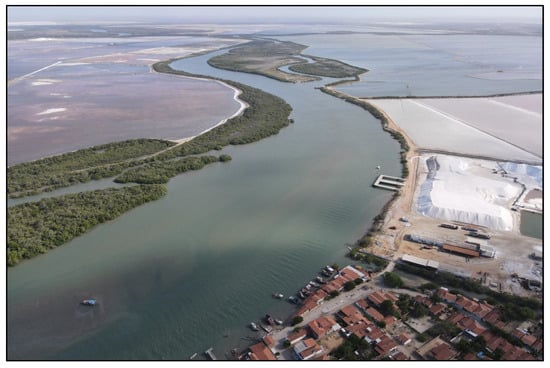 The Hypersaline Desert site in the municipality of Porto do Mangue (Figure 7) corresponds to the extensive and shallow fluviomarine plains of the Açu River. The soil impermeability, low and flat topography, and low flow and high evapotranspiration rates of the area prevent the formation of mangrove ecosystems, and the extreme local salinity inhibits the growth of most biotic species [24]. The salinity comes in from the tides which flood a large part of the plains because of their low altitude, generally below three metres. Due to the impermeability of the soils and the high evapotranspiration rates, the sodium chloride dissolved in the seawater will crystallise and salinise the soil, thus preventing the growth of biotic species and generating the desert landscape. The whitish and greyish colours in the area are the main characteristic of the White Coast (Figure 7).