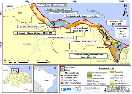 The quantitative evaluation was carried out for the twelve potential sites of geomorphological interest distributed among the municipalities of Tibau, Grossos, Areia Branca, and Porto do Mangue. The knowledge of the sites was obtained through previous surveys and added field activity.
