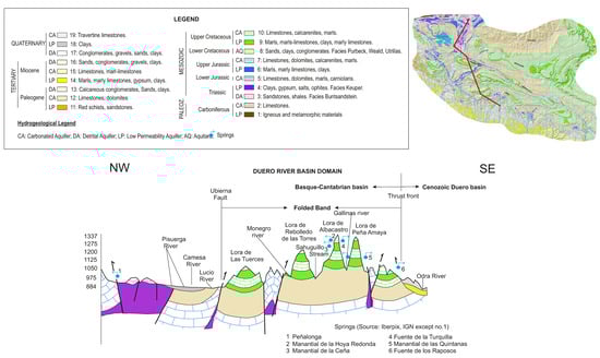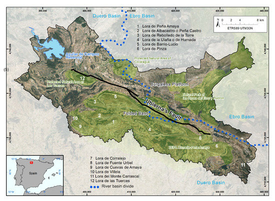 - De la Hera-Portillo, A.; Llorente, M.; López-Gutiérrez, J.; Salman, K.; Sánchez, J.A.; Gallego Rojas, N.; Ballesteros, D.; Moreno, L.; Corral Lledó, M.M.; Galindo Rodríguez, E.; et al. Hydrogeological Setting of Las Loras UNESCO Global Geopark (Palencia-Burgos, Spain): State of Knowledge and Needs for Water Resources Sustainability Research. In Eurokarst 2022, Málaga. Advances in karst Science; Andreo, B., Barberá, J.A., Durán-VAlsero, J.J., Gil-Márquez, J.M., Mudarra, M., Eds.; Springer: Cham, Switzerland, 2022; pp. 249–254. [Google Scholar] [CrossRef]