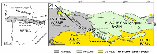 - Hernáiz, P.P. La falla de Ubierna (margen SO de la cuenca Cantábrica). The Ubierna falut (S.W. margin of the Cantabrian basin). Geogaceta 1994, 16, 39–41. [Google Scholar]