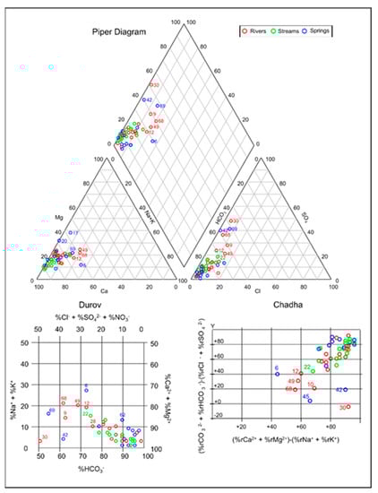 - Chadha, D.K. A proposed new diagram for geochemical classification of natural waters and interpretation of chemical data. Hydrogeol. J. 1999, 7, 431–439. [Google Scholar] [CrossRef]