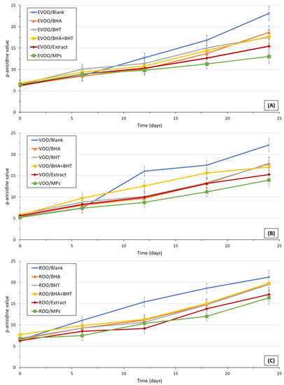 The p-AV measures the α- and β-alkenals as secondary oxidation products [31]. p-anisidine is a compound that strongly reacts with aldehydes forming products that absorb at a wavelength of 350 nm. It corresponds to the absorbance of a solution resulting from the reaction of the fat or oil with p-anisidine in an isooctane solution. The products formed by reaction with unsaturated aldehydes, namely 2-alkenals, absorb intensely at 350 nm. Therefore, the p-AV tests are exceptionally sensitive to these oxidation products. The p-AV is a measure of the presence of secondary oxidation products, namely ketones, aldehydes, and carboxyl acids [29,42]. Results regarding the p-AV levels of EVOO, VOO, and ROO during the 24-day storage are shown in Figure 1.